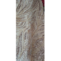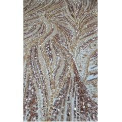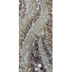 Principais Aplicações: Tecido com base em tule ilusione coreano bordado em paetês, vidrilhos e miçangas.