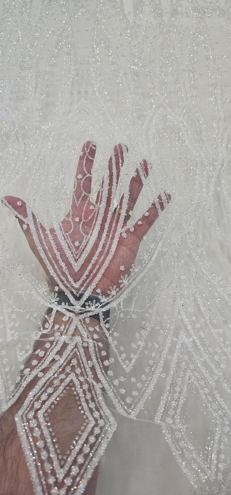 Tecido com base em tule com qualidade coreana com glitter e mini diamantes aplicados em toda extensao do tecido.